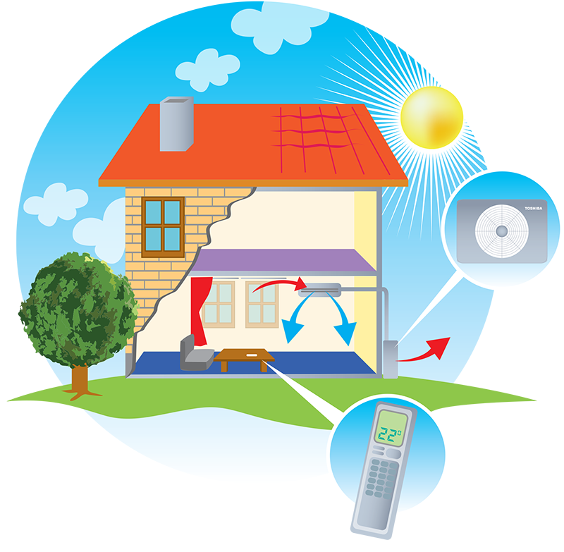 Binnendeel en buitendeel werken samen om de temperatuur in een ruimte te beheersen. Het systeem kan worden ingesteld door middel van één afstandsbediening via het binnendeel.
